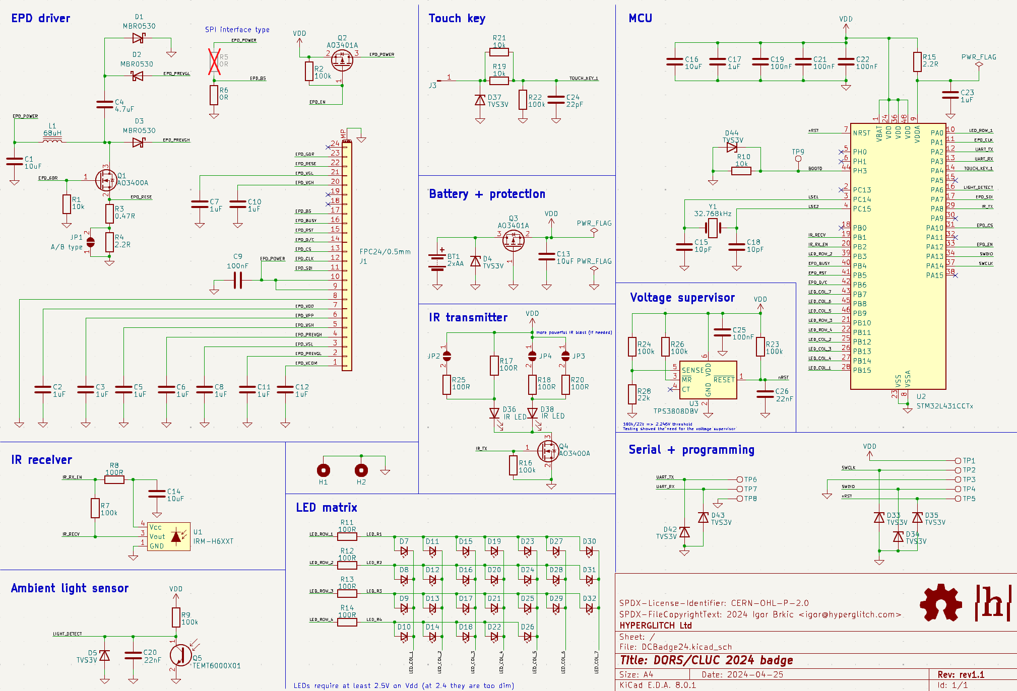 The badge is based on the STM32L431 microcontroller. The e-paper display is Waveshare 2.66" monochromatic display (raw panel) connected to the SPI port with the driving circuitry on the PCB. The rest of the schematic is pretty straightforward - ambient light sensor, IR transmitter and receiver, touch sensor, and a bunch of blue LEDs connected in matrix.