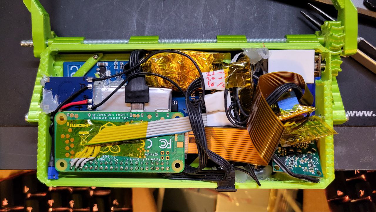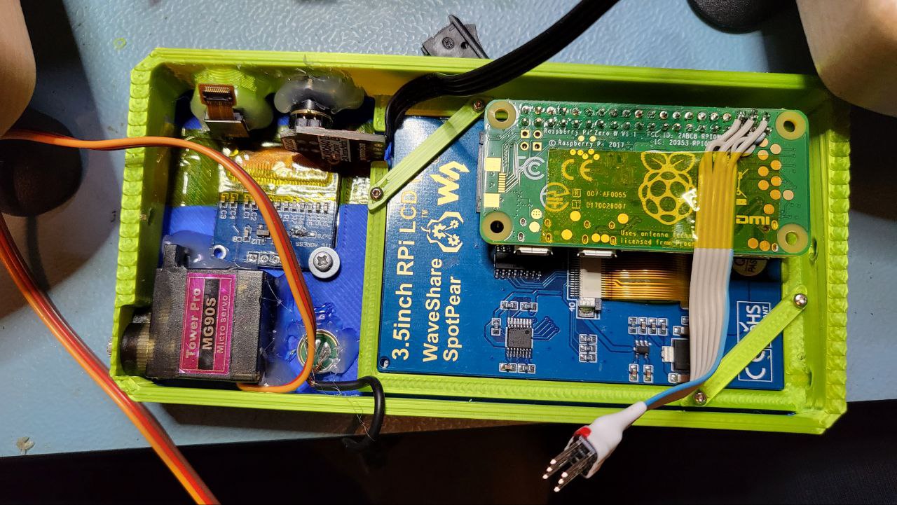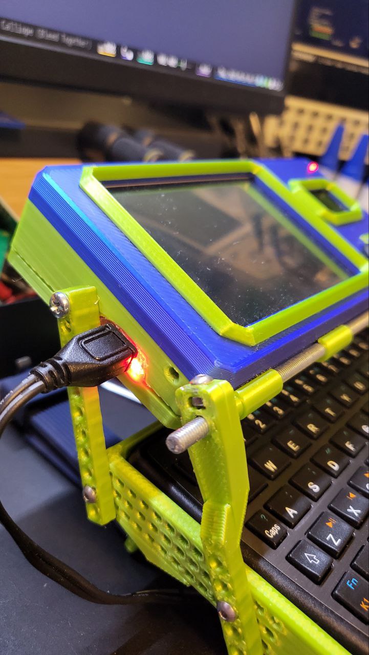 Device is based on the Raspberry Pi Zero W Soc. It contains one main 3.5" SPI TFT screen and additional 1" OLED screen. Additionally, it has BT keyboard, pi camera and MLX90640 thermal camera. The casing is 3D printed on Prusa Mini. It has a motor and a linkage system which enables it to (semi) automatically switch between just the display mode and full terminal (display+keyboard) mode.