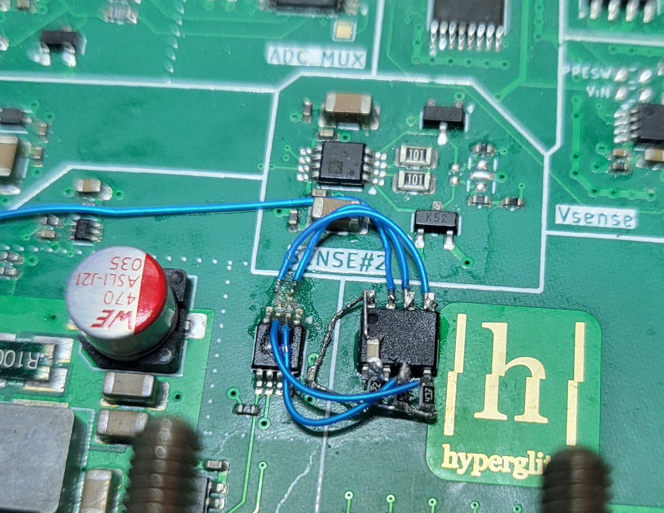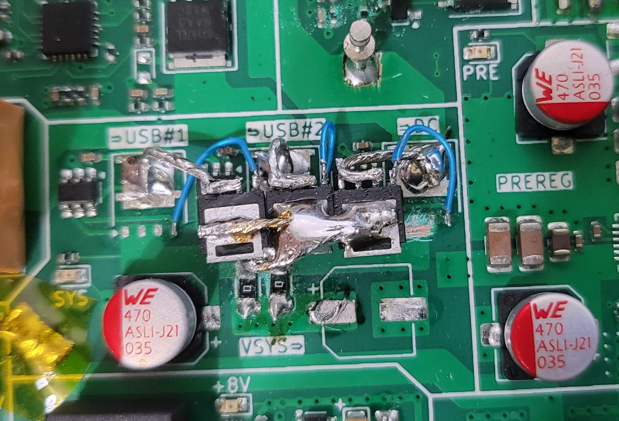 There were few mistakes in the hardware design that I had to address. The first one was with the input power selector. It turned out that I put the MOSFETs (which were suppose to act as ideal diodes) in the wrong orientations (which made them behave as regular diodes). A bit of rework (first image below) fixed that. "Fun" thing: after fixing the power ORing part, I went to double check everything. It was already past 2AM (and nothing good ever happens after 2AM) and I was checking some pins with multimeter probe and accidentaly shorted the 15V from the input to one of the VSENSE pins going directly to the MCU which, of course, fried the whole MCU. And replacing the 100-pin LQFP package is really not fun, especially since the fab house used some higher temperature solder paste and this is a 6 layer board with a lot of copper inside. Lesson learned: always add inline resistors to MCU pins.