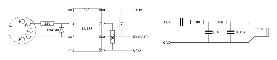 I was also too lazy to make a proper PCB for the components so they are floating inside the box, isolated with tape (as seen on image below :)). Schematics for the MIDI in and audio out are below, and the SD card pinout is in the file pins.txt in the source code repository . Power supply is made using one of those cheap car phone chargers.