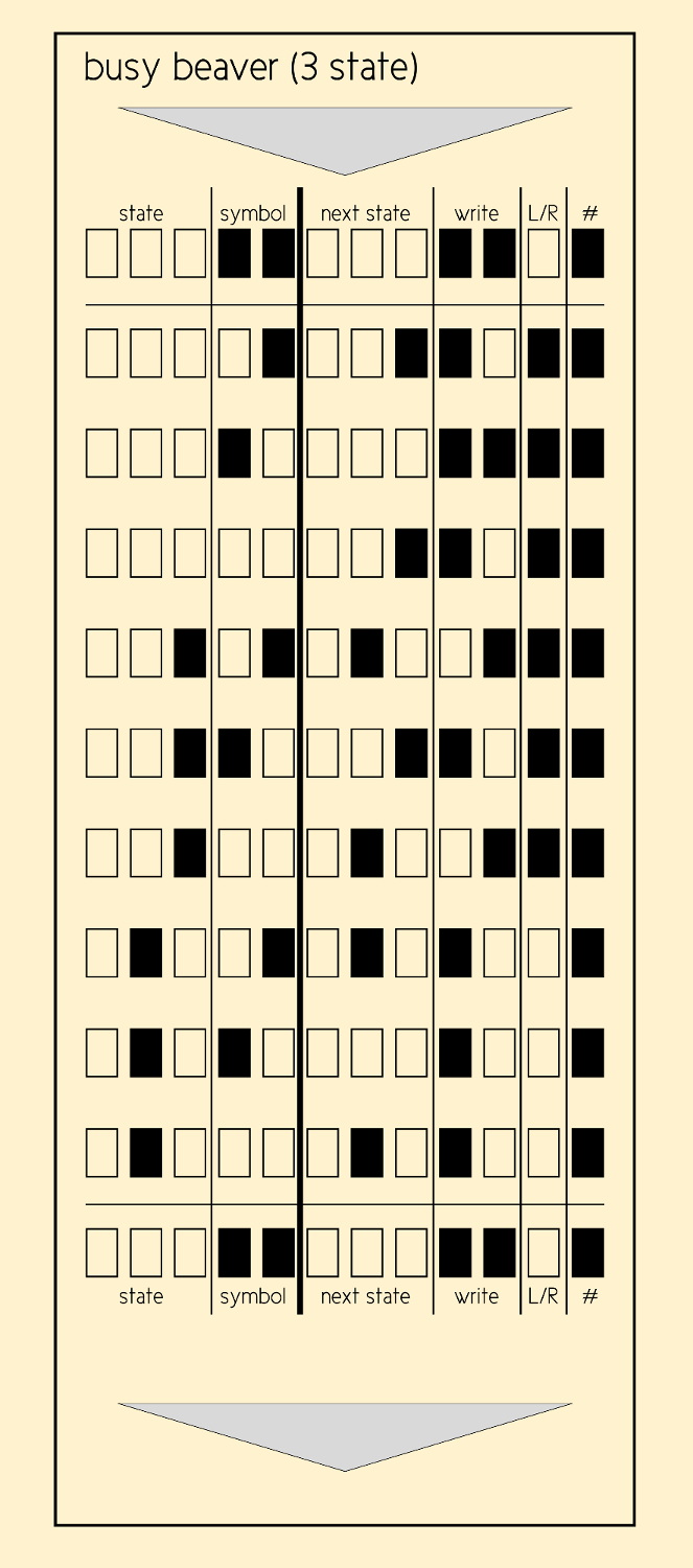 Algorithm for the machine is defined on the punched card. Internal states are defined with three bits (allowing max eight states), symbol is defined with two bits (00-blank, 01-zero, 10-one, 11-reserved) and move direction with 1 bit (0-left, 1-right). there is additional hole on the card required for correct operation. First and last rules on the card are special — they are used for marking the beggining and the end of the card so that it is easy to scan the card over and over. Start/end rules is defined with tape symbol and write symbol equal to 11. Halting rule is defined by setting write symbol to 11.