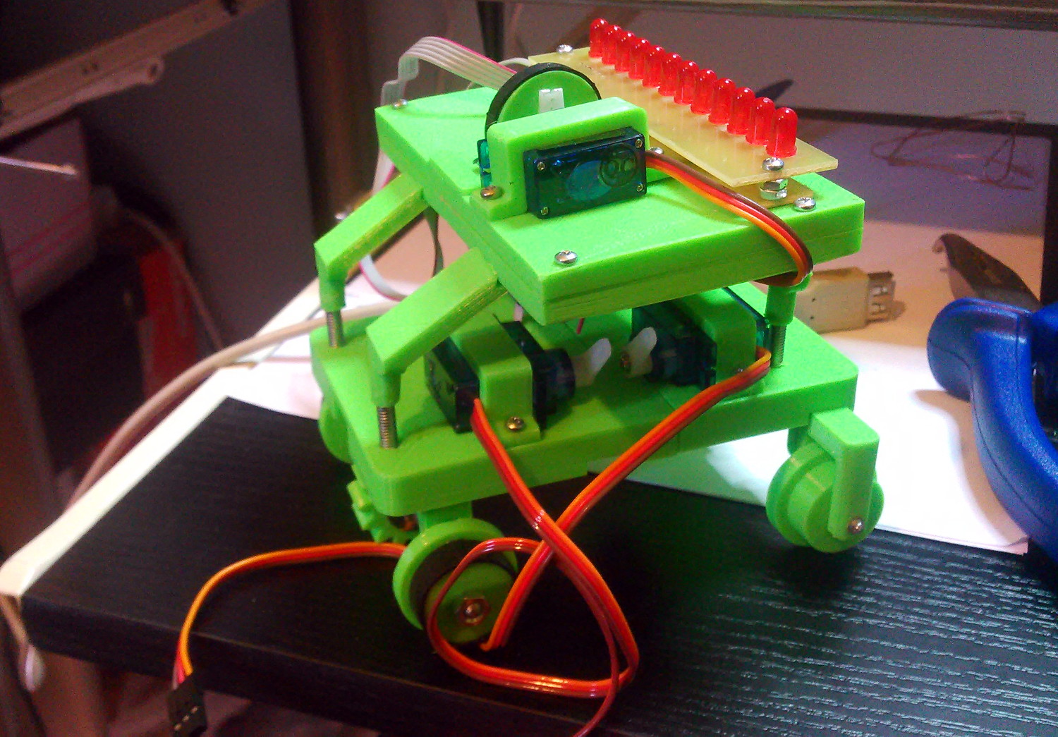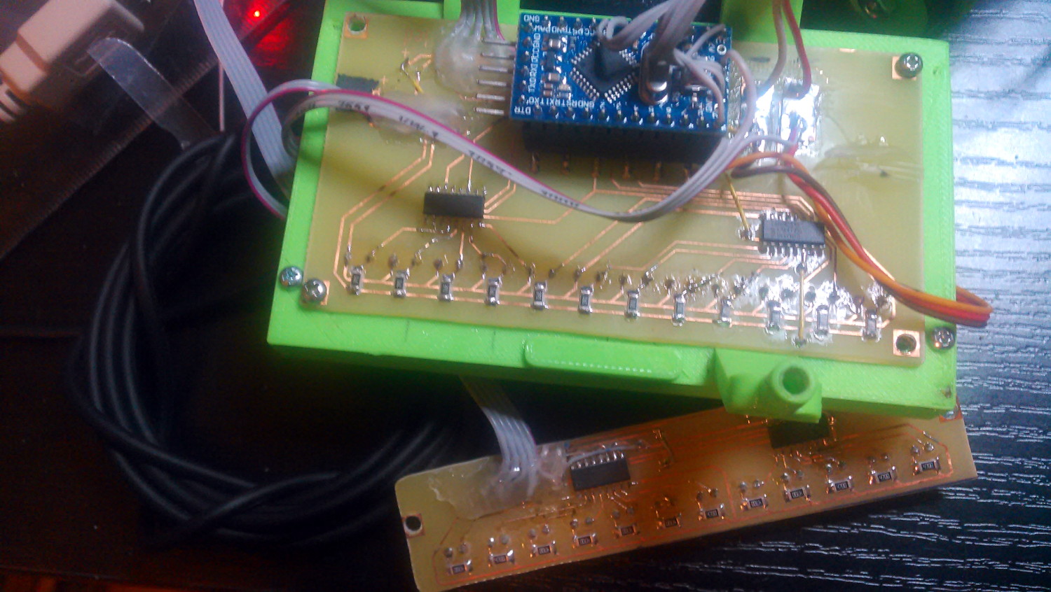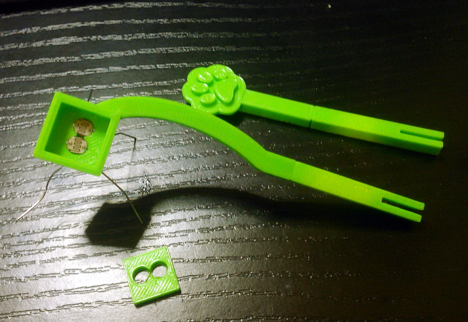 Writing head is simple — it is just a piece of wire connected to GND and moved with small servo. Reading head consists of two LDRs with color filters — one for green and one for red color (color filters are just pieces of colored shopping bag).