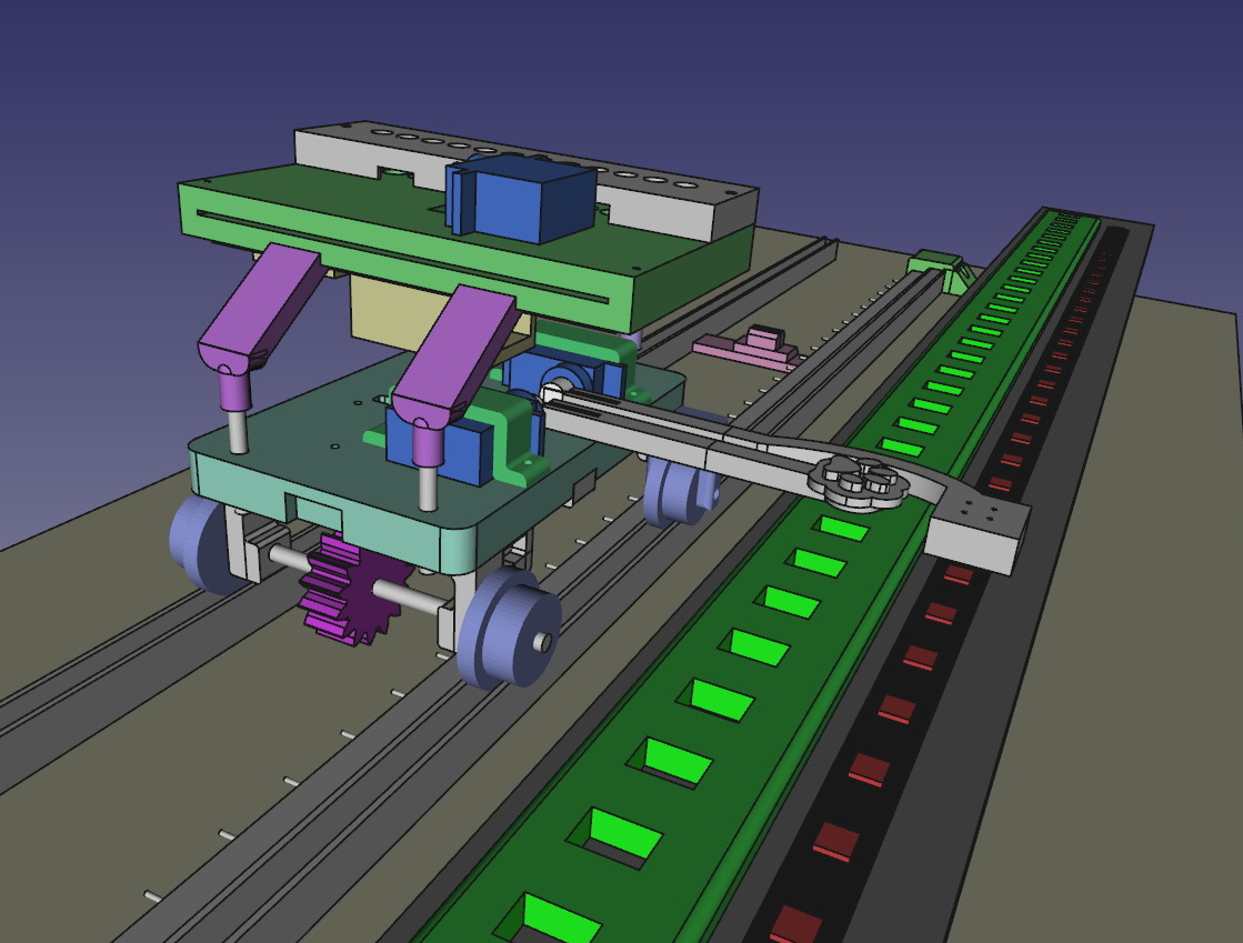 Along the rails there are position markers (blue LEDs). Vehicle has a LDR on the bottom which reads those LEDs and uses them for aligning to memory cells (this doesn't work perfectly so sometimes it has to "wiggle" a bit around the cell).