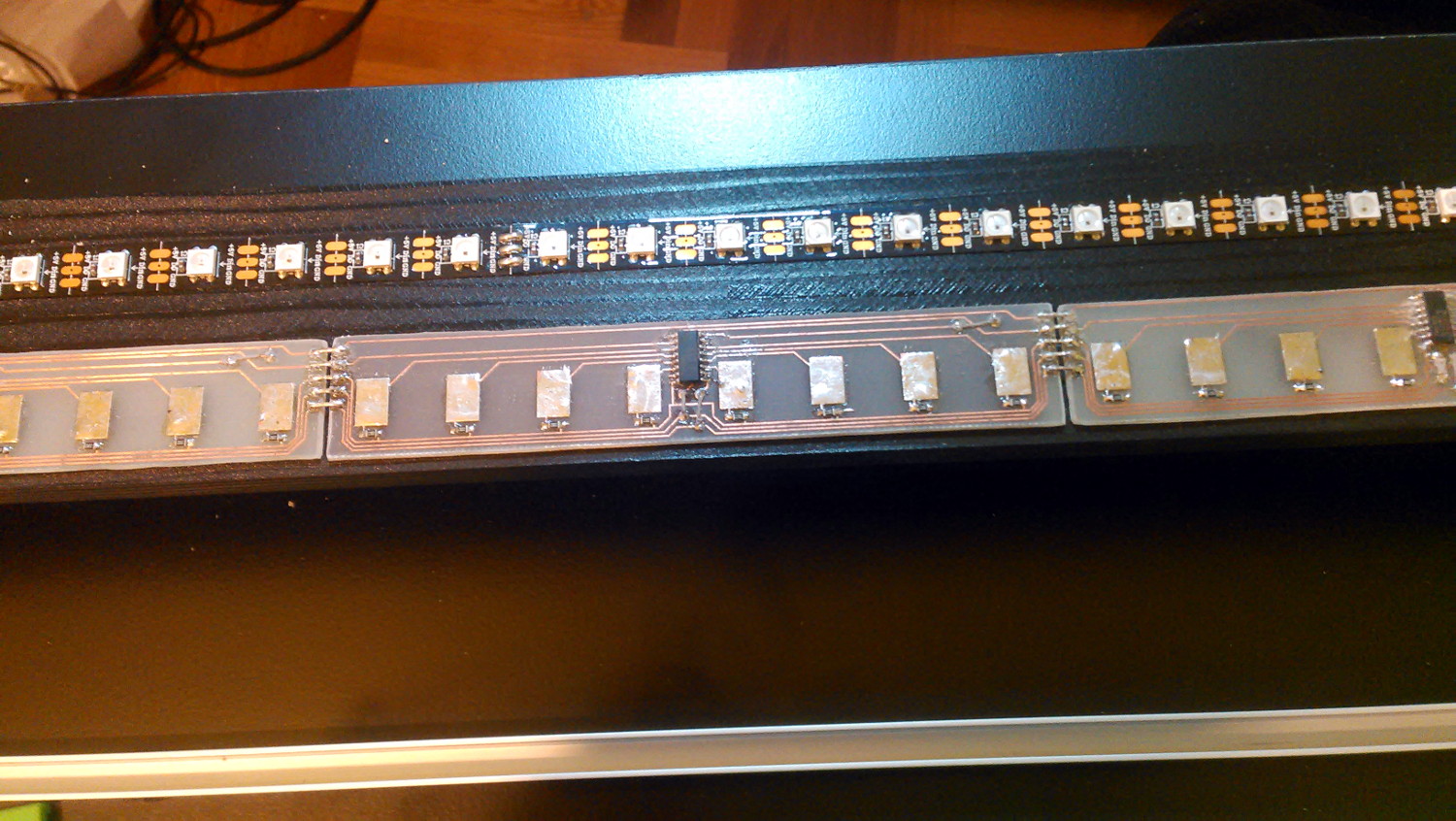 For LED strip I used the WS2812 ("Neopixel") strip with 56 LEDs controlled by Arduino Pro Mini. Input "keys" are just a bunch of pads, pulled high and connected to seven 74HC595 shift registers enabling me to read all 56 pads with just a few pins. Kicad project (schematic and PCB) for the input keys is in the repository (tape_pcb/).